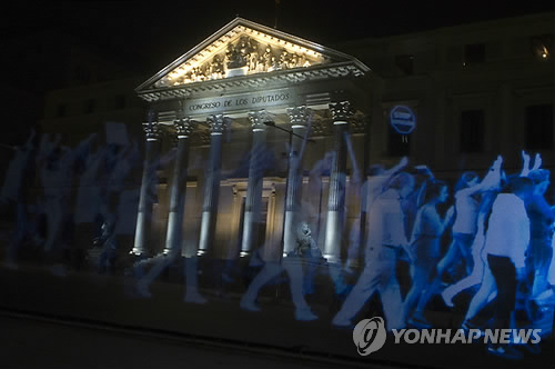 (파리=연합뉴스) 박성진 특파원 = 스페인 정부가 공공건물 주변 시위를 금지하는 새 법을 통과시킨 데 항의해 11일(현지시간) 의회 앞에서 홀로그램 시위가 벌어졌다.