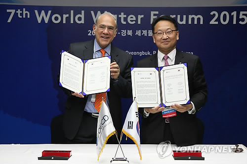 | △ 국토부, OECD와 물관리 정책 공동연구 추진 (서울=연합뉴스) 유일호 국토교통부 장관(오른쪽)과 앙헬 구리아 경제협력개발기구(OECD) 사무총장이 지난 12일 대구 엑스코에서 OECD 회원국들의 물 수요 관리정책을 비교, 국내 실정에 맞는 정책 시사점을 찾아내는 공동연구를 진행하기 위한 협력의향서를 체결하고 있다. << 국토교통부 제공 >> photo@yna.co.kr |