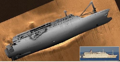 음향센서로 세월호의 외형을 탐사한 뒤 3차원 영상으로 처리한 결과 세월호는 수심 44m 지점에 왼쪽면이 바닥에 닿은 채 누워있다.