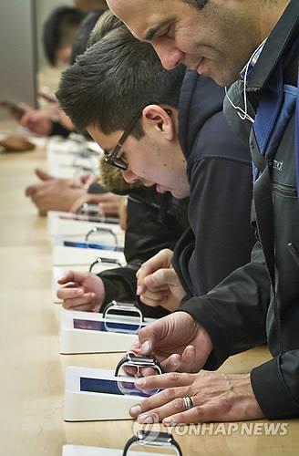 | △ 애플의 스마트시계 '애플 워치'의 예약주문이 시작된 10일 뉴욕 시민들이 매장에서 애플 워치를 시연해보고 있다. (AP=연합뉴스 자료사진) |
