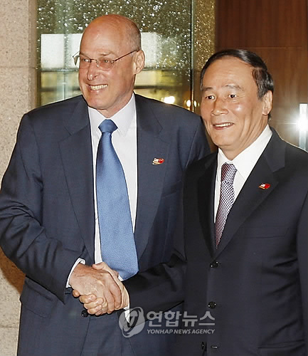 | △ 2008년 왕치산 당시 중국 부총리와 만났을 때의 헨리 폴슨 전 미국 재무장관 - 자료사진 |