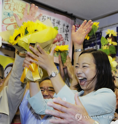 | △ (도쿄 교도=연합뉴스.자료사진) 일본공산당의 기라 요시코(吉良佳子) 참의원이 2013년 참의원 선거 승리후 당선 축하 화환을 받아들고 기뻐하는 모습. |