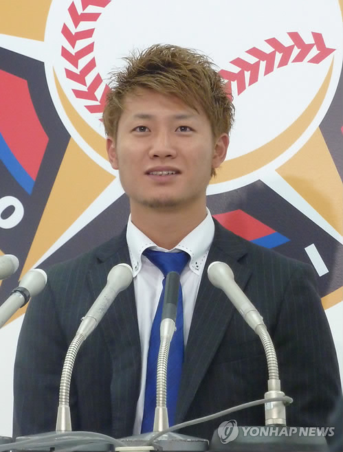 | △ '타율은 1할, 출루율은 4할'…니혼햄 니시카와 하루키 (삿포로 교도=연합뉴스) 일본프로야구 퍼시픽리그 선두를 달리는 니혼햄 파이터스의 우투좌타 내야수 니시카와 하루키(23)가 선구안의 야구를 펼쳐보이고 있다. 니시카와는 14일 현재 팀의 13경기 중 10경기에 나와 32타수 6안타로 타율 0.188에 그쳐 규정 타석을 채운 타자 42명 중 타율 34위에 머물렀지만 출루율은 0.422로 팀 내 1위를 달리고 있다. 사진은 지난해 12월2일 일본 홋카이도(北海道) 삿포로(札晃) 시내 구단 사무실에서 기자회견하는 니시카와. 2015.4.14 chungwon@yna.co.kr |