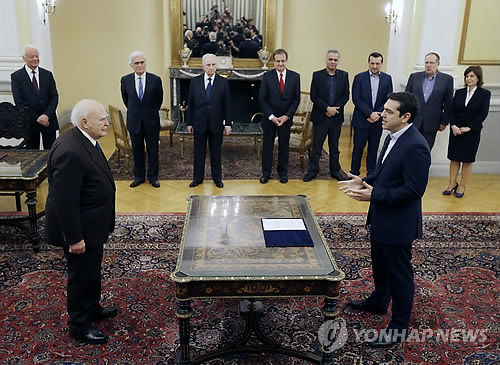 | △ 급진좌파연합(시리자) 대표 알렉시스 치프라스(오른쪽)가 총리 취임 선서를 하고 있다.(AP=연합뉴스 자료사진) |