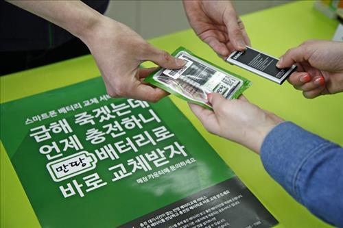 (서울=연합뉴스) 이유미 기자 = 편의점 씨유(CU)는 다음 달부터 일부 점포에서 방전된 휴대전화 배터리를 충전된 다른 배터리로 교체해주는 '휴대전화 배터리 교환 서비스'(3천원)를 시작한다고 14일 밝혔다.