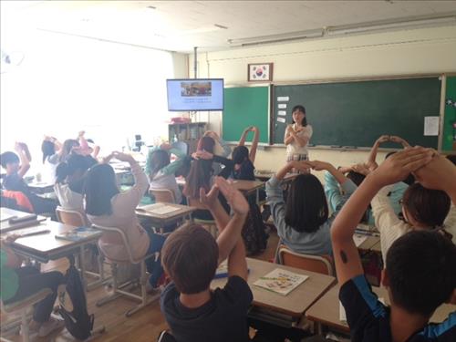 학생들은 전문 강사가 알려주는 각 나라의 인사법과 제스처를 직접 따라 하며 다른 문화 체험에 한창이었다.
