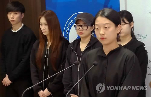 | △ 전북대 무용과생들 "학생 강제동원한 교수 퇴출 운동" (전주=연합뉴스) 최영수 기자 = 전북대 무용과 학생 대표와 졸업 동문들이 14일 오전 도교육청에서 "'수퍼갑질'과 인권 무시 및 학습권 박탈을 일삼는 이모(여·54) 교수의 횡포에 더 이상 참을 수 없다"며 교수 퇴출 운동에 들어간다고 밝히고 있다. 2015.4.14 kan@yna.co.kr |