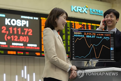 코스피지수는 이날 외국인 매수세에 힘입어 전날보다 12.80포인트(0.61%) 오른 2,111.72로 마감했다.