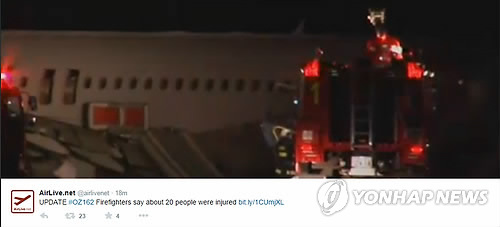 | △ 아시아나 항공기 히로시마에서 활주로 이탈 (서울=연합뉴스) 14일 아시아나항공 여객기가 일본 히로시마(廣島) 공항에 착륙하면서 활주로를 벗어나는 사고가 발생, 23명이 부상했다고 교도통신이 보도했다. 사진은 사고 뒤 활주로에 정지 돼 있는 아시아나 항공기의 모습. 2015.4.14 << Air live 트위터 페이지 캡처 >> photo@yna.co.kr |