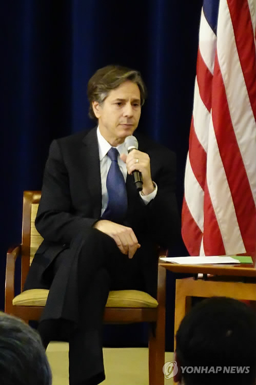 | △ 간담회에서 답변하는 토니 블링큰 미국 국무부 부장관 (워싱턴=연합뉴스) 김세진 특파원 = 토니 블링큰 미국 국무부 부장관이 14일(현지시간) 워싱턴DC 국무부 본부에서 '미일관계 70주년'을 주제로 열린 타운홀 미팅 간담회에서 한국과 일본 간 관계에 "상당히 긍정적 궤도에 오른 것으로 보인다"고 평가했다. |
