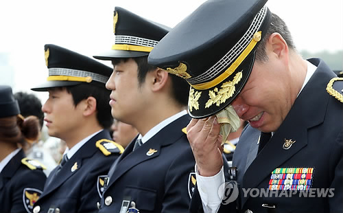 | △ 청년 경찰 떠나보내는 동료의 눈물 (수원=연합뉴스) 신영근 기자 = 15일 오전 경기도 수원 경기지방경찰청에서 지난 13일 고속도로에서 교통법규 위반차량을 단속하던 중 광역버스에 치여 순직한 경기청 고속도로순찰대 김승규(30) 경사 영결식이 열려 젊은 동료를 떠나보내는 경찰이 흐르는 눈물을 손수건으로 닦고 있다. 2015.4.15 drops@yna.co.kr |