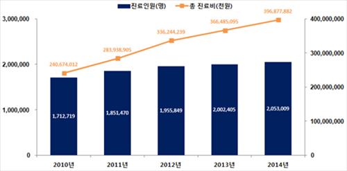 총진료비는 2010년 약 2천407억원에서 2014년 약 3천969억원으로 1천562억원(64.9%)이 늘었다.