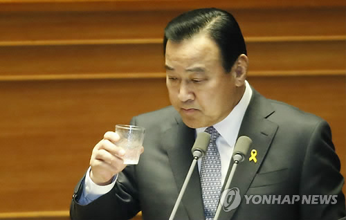 | △ 목 축이는 이완구 총리 (서울=연합뉴스) 이상학 기자 = 이완구 국무총리가 15일 국회 본회의장에서 열린 경제분야 대정부질문에서 물을 마시고 있다. 2015.4.15 leesh@yna.co.kr |