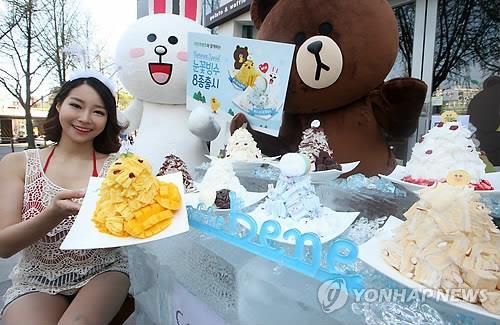 | △ 지난 13일 카페베네 서대문경찰서점에서 모델들이 모바일 메신저 '라인' 캐릭터를 활용한 8종의 눈꽃빙수들을 선보이고 있다. |