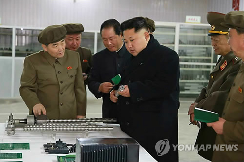 | △ 북한 김정은 국방위원회 제1위원장이 군수용 전자설비를 생산하는 평양약전(弱電)기계공장을 시찰하는 모습으로 노동신문이 지난 8일 보도했다. 평양약전기계공장은 평양시 만경대 구역에 있으며 미사일 등 군사장비에 필요한 전자 설비를 생산하는 곳으로 알려졌다. <<연합뉴스DB>> |