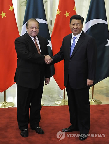| △ 지난해 11월 중국 베이징에서 열린 아시아태평양경제협력체(APEC) 정상회의 참석차 중국을 방문한 나와즈 샤리프(왼쪽) 파키스탄 총리와 시징핑 중국 국가주석이 악수하고 있다.(EPA=연합뉴스DB) |