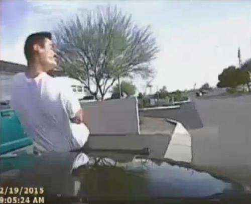 16일(현지시간) 미국 언론에 따르면 미국 애리조나 주 마라나에서 지난 2월19일 라이플총을 들고 길거리를 배회하던 절도용의자 마리오 발렌시아(36)를 경찰 순찰차가 그대로 들이받았다.