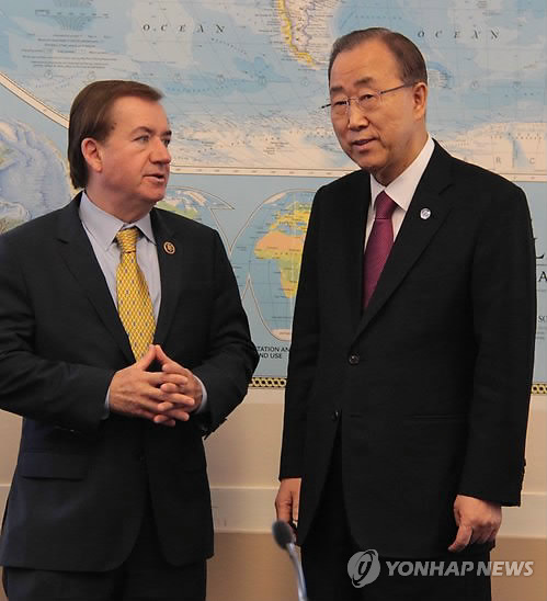 | △ 반기문 유엔 사무총장-미국 하원 외교위원장, 워싱턴DC서 글로벌 현안 논의 (워싱턴=연합뉴스) 심인성 특파원 = 반기문 유엔 사무총장과 에드 로이스(공화·캘리포니아) 미국 하원 외교위원장이 16일(현지시간) 워싱턴DC 의회 레이번 빌딩에서 만나 테러 대책 등 글로벌 이슈에 대해 논의하고 있다. 반 총장은 회동 직후 연합뉴스 기자와 단독으로 만나 반 총장 자신의 차기 대권 출마를 막고자 경남기업에 대한 수사가 시작됐다는 취지의 성완종 전 경남기업 회장의 자살 전 주장과 관련해 "당혹스럽다"면서 "이번 사안은 나와 전혀 관계가 없다"고 일축했다. |