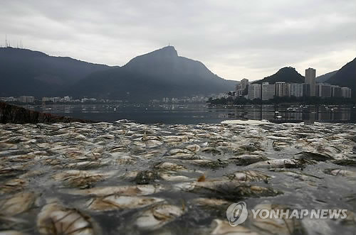 | △ 여기서 어떻게 경기하라고… (리우데자네이루 EPA=연합뉴스) 2016년 리우데자네이루 하계올림픽을 앞두고 수질오염을 둘러싼 논란이 갈수록 확산되는 가운데 16일(현지시간) 조정과 카누 경기가 열릴 로드리고 데 프레이타스 호수에 폐사된 물고기 떼가 둥둥 떠 있다. 이번 주에만 37톤의 물고기 사체가 이 호수에서 수거됐다. 2010596@yna.co.kr |
