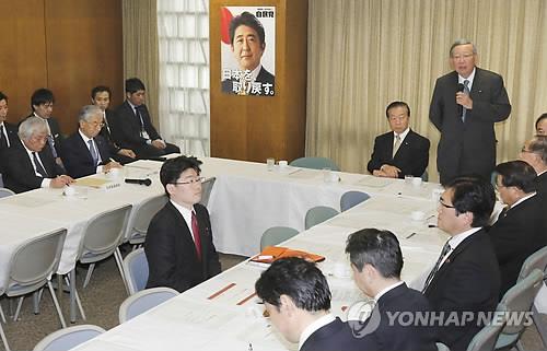 | △ 17일 자민당 정보통신전략조사회에서 가와사키 지로(川崎二郞) 회장이 인사말을 하고 있다.(도쿄 교도=연합뉴스) |