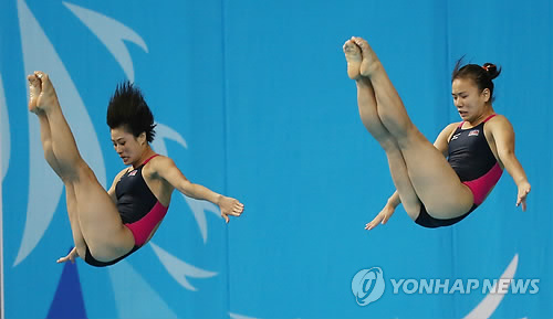 | △ 북한 다이빙 선수들이 여자 싱크로나이즈 3m 스프링보드에서 뛰어내리고 있다(연합뉴스 자료사진) |