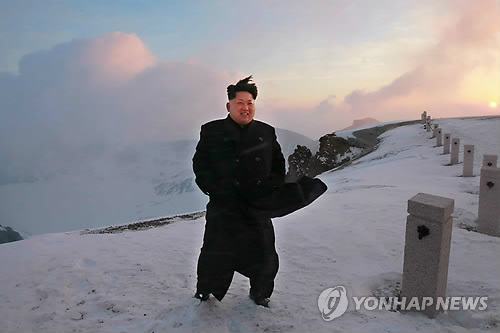 | △ 김정은 북한 국방위원회 제1위원장이 18일 오전 백두산에 올라 해돋이를 지켜보는 모습으로 노동신문이 19일 보도했다. 2015. 4. 19 <<연합뉴스DB>> |