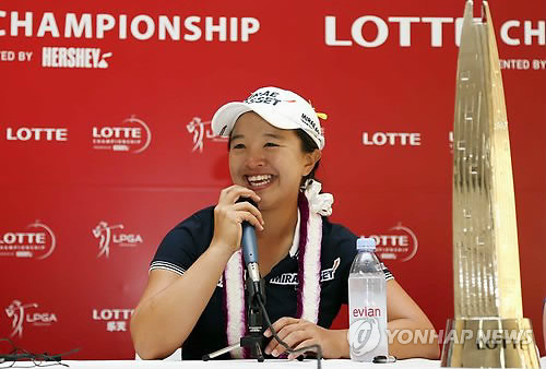 | △ -LPGA- 김세영, 우승 인터뷰 (서울=연합뉴스) 미국여자프로골프(LPGA) 투어 롯데 챔피언십(총상금 180만 달러)에서 우승을 차지한 김세영(22·미래에셋)이 19일(한국시간) 미국 하와이주 호놀룰루 오아후 코올리나 골프클럽(파72·6천383야드)에서 열린 대회 마지막 날 4라운드 18번홀 연장전에서 샷 이글로 짜릿한 우승을 차지한뒤 인터뷰하고 있다. 2015.4.19 << LOTTE/박준석 제공 >> photo@yna.co.kr |