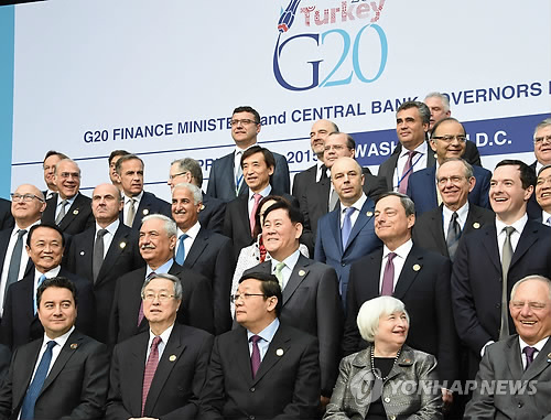 | △ 기념촬영하는 최경환 부총리 (서울=연합뉴스) 최경환 부총리 겸 기획재정부 장관이 17일(현지시간) 워싱턴 IMF에서 열린 G20재무장관·중앙은행총재회의에 참석, 각국 참석자들과 기념사진을 찍고 있다. photo@yna.co.kr |