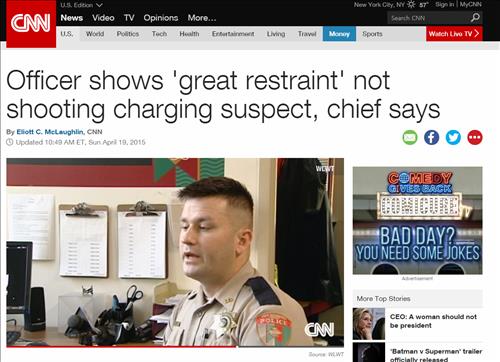 미국 CNN 방송은 생명의 위협을 느낀 순간에서도 끝까지 참아 총을 쏘지 않고 살인 사건 용의자를 검거한 제시 키더 경관의 얘기를 19일(현지시간) 집중적으로 조명했다.