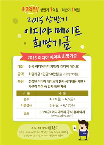 '이디야 메이트 희망기금'으로 이름 부쳐진 이 돈은 상·하반기에 각각 1억원씩 지급된다. 이 기금은 지난 2013년 3천만원으로 시작돼 작년부터 연 2억원으로 늘었다.