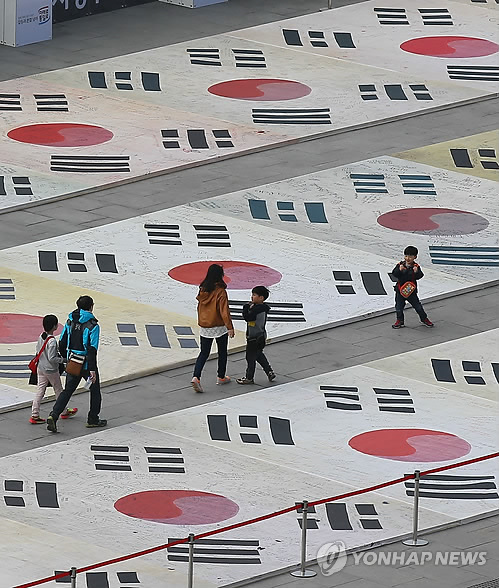 | △ 광화문 광장에 펼쳐진 대형 태극기들 (서울=연합뉴스) 김도훈 기자 = 대한민국 임시정부수립일을 나흘 앞둔 9일 오후 서울 광화문 광장에 애국선열에 대한 감사의 메시지와 통일에 대한 시민들의 염원을 적은 대형 태극기들이 전시돼 있다. 2015.4.9 superdoo82@yna.co.kr |