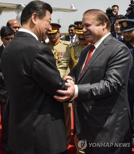 | △ 20일 파키스탄을 방문한 시진핑(왼쪽) 중국 국가주석을 나와즈 샤리프 파키스탄 총리가 공항에서 영접하고 있다.(EPA=연합뉴스) |