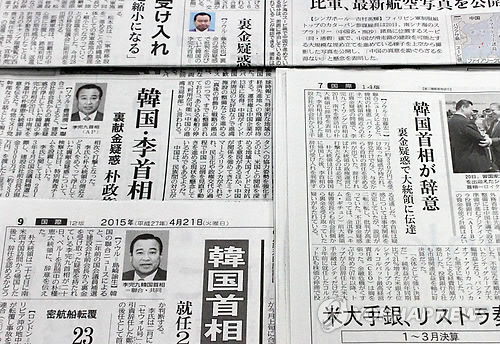 | △ 이완구 총리 사의 보도한 일본 신문 (도쿄=연합뉴스) 이세원 특파원 = 이완구 한국 국무총리가 사의를 표명했다는 소식을 21일 일본 주요 신문이 기사로 다뤘다. 2015.4.21 sewonlee@yna.co.kr |