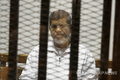 | △ 카이로의 경찰학교 법정 피고인 감금소에 앉아 있는 무함마드 무르시 전 이집트 대통령.(연합뉴스 자료사진) |