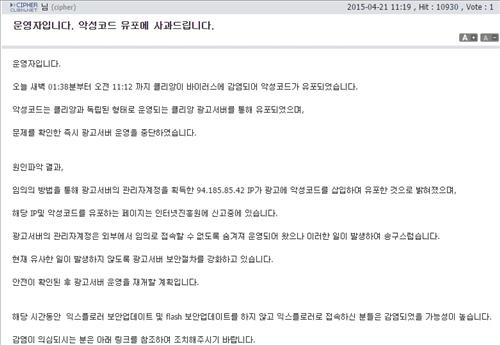 한편 클리앙 측은 악성코드 유포 당일 운영자 공지를 통해 감염 사실을 알리고 사과했으며 보안 절차를 강화하고 있다고 밝혔다.