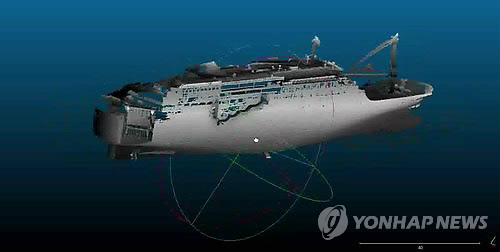 조류가 우리나라에서 울돌목 다음으로 빠른 맹골수도 수심 약 44m 지점에 뱃머리를 동쪽 53도 방향으로 두고 좌측면이 바닥에 닿게 누워있는 세월호.