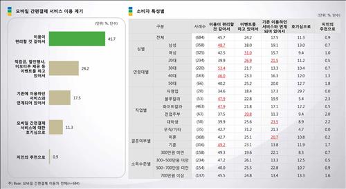 해당 서비스를 이용하는 이유로는 이용의 편리성(45.7%)이라고 답한 비율이 가장 높았고 이어 결제 혜택(24.2%), 기존 서비스와의 연계성(17.5%), 서비스에 대한 호기심(11.3%) 등의 순이었다.