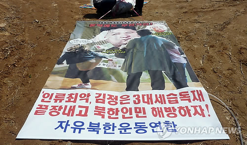 | △ 탈북단체, 대북전단 또 살포 (서울=연합뉴스) 차지연 기자 = 박상학 자유북한운동연합 대표는 21일 오후 인천시 강화군에서 대북전단 15만장과 영화 '더 인터뷰' DVD·USB 5천개를 풍선에 달아 북쪽으로 보냈다고 밝혔다. 사진은 살포된 풍선에 매달린 포스터. 2015.4.22 << 박상학 대표 제공 >> charge@yna.co.kr |