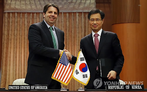 | △ 한미원자력협정 타결 (서울=연합뉴스) 전수영 기자 = 한미원자력협정이 4년 6개월여간의 협상 끝에 타결, 22일 오후 서울 세종로 외교부 청사에서 박노벽 외교부 원자력 협력대사와 마크 리퍼트 주한 미국대사가 협정에 가서명한 뒤 악수하고 있다. swimer@yna.co.kr |
