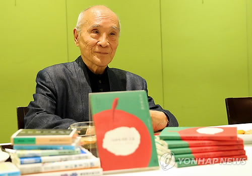 | △ 일본 '국민 시인' 다니카와 �타로 시선집 출간 (서울=연합뉴스) 일본 '국민 시인'으로 불리는 다니카와 �타로의 시와 산문 일부를 한글로 번역한 시선집 '사과에 대한 고집'이 출간됐다. 책 출간을 기념해 22일 방한한 다니카와 작가가 서울 중구 정동에서 열린 기자간담회에서 발언하고 있다. 2015.4. 22 <<비채 제공>> photo@yna.co.kr |