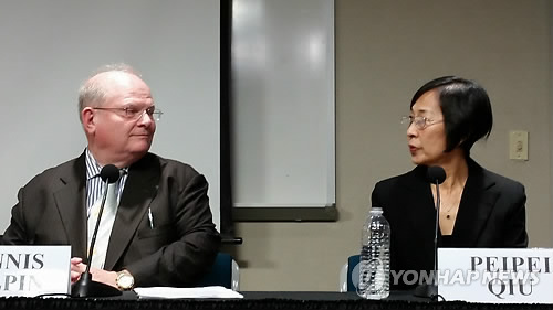 | △ 지난해 10월 미국 존스홉킨스대 국제관계대학원(SAIS) 주최 위안부 토론회에 참석한 데니스 핼핀 존스홉킨스대 국제관계대학원 연구원(왼쪽)과 뉴욕 바사 칼리지의 페이페이 추 교수.(연합뉴스 자료사진) |