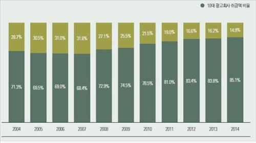 이들 10대 광고회사의 비율은 2007년 68.4%에서 2008년 72.9%로 오른 이후 증가세를 이어왔다.
