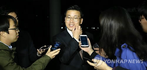 | △ 질문에 답하는 이용기 수행비서 (서울=연합뉴스) 한종찬 기자 = 성완종 전 경남기업 회장의 핵심 측근인 이용기 수행비서가 23일 오전 서울 중앙지검에서 소환 조사를 마친 뒤 귀가하며 취재진 질문에 답하고 있다. saba@yna.co.kr |