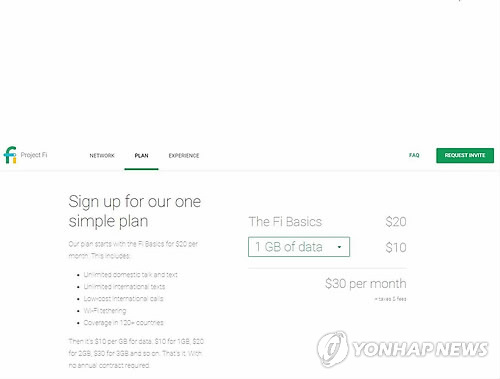 | △ 구글 이동통신 '프로젝트 파이'…무제한통화에 기본료 20달러 (샌프란시스코=연합뉴스) 임화섭 특파원 = 세계 최대 인터넷 기업 구글은 '프로젝트 파이'라는 이동통신 서비스 상품을 미국에서 내놓기로 했다고 22일(현지시간) 밝혔다. 무제한 음성·무제한 문자 서비스는 월 20달러(2만1천600원), 데이터는 1 기가바이트(GB)에 10달러(1만800원)이며 사용하지 않은 데이터 요금은 달러 단위로 돌려준다. 약정 등 조건은 없다. 화면은 구글의 프로젝트 파이 가입신청 페이지. 2015.4.23 solatido@yna.co.kr |