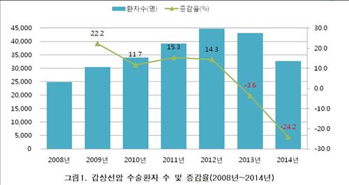 갑상선암 수술 환자는 2008~2012년 매년 평균 15.8%씩 급증하는 추세였지만 2013년 증가세가 꺾여 3.6% 감소했으며 작년에는 이보다 더 크게 줄어들었다.