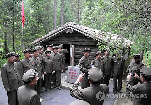 | △ 북한 전국 당 책임일꾼 백두산지구 혁명전적지답사행군대가 김정일 국방위원장의 출생지인 '백두산밀영고향집'을 방문한 모습으로 조선중앙통신이 지난해 8월 2일 보도했다. 2015.4.23.<<연합뉴스DB>> |