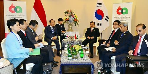 | △ 황우여 사회부총리 겸 교육부 장관(왼쪽)이 23일(현지시각) 인도네시아 자카르타에서 열리고 있는 60주년 기념 아시아-아프리카 정상회의에 참석, 유숩 칼라 인도네시아 부통령과 면담을 하고 있다. |