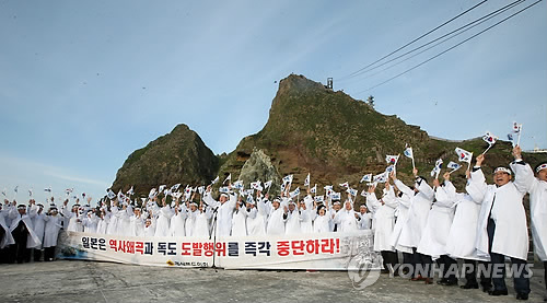 | △ 경북도의회, '일본 규탄한다' (독도=연합뉴스) 김준범 기자 = 23일 오후 독도선착장에서 경북도의원들이 일본의 역사 왜곡·독도 도발을 규탄하며 구호를 외치고 있다. 경북도의회는 이날 광복 70주년을 맞아 독도에서 제277회 도의회 임시회 제1차 본회의를 열였다. 2015.4.23 psykims@yna.co.kr |