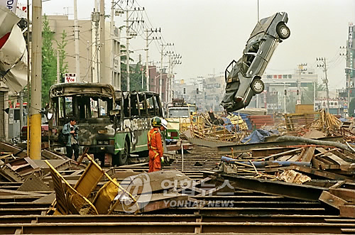 | △ (대구=연합뉴스) 대구시 달서구 상인동 지하철 폭발사고 현장에 사고당시 뒤집힌 차량들이 공사장 빔사이에 널려 있어 전쟁터를 방불케 하고 있다. 1995.4.29 (본사자료) <저작권자 ⓒ 2009 연 합 뉴 스. 무단전재-재배포 금지.> |