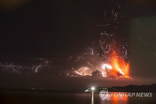 | △ 칼부코 화산 내리치는 '화산 번개' (푸에르토 몬트<칠레> EPA=연합뉴스) 22일(현지시간) 칠레 남부 안데스 산맥에 위치한 칼부코 화산이 폭발하면서 내뿜어 낸 화산재 사이로 화산 번개가 만들어지고 있다. 2010596@yna.co.kr |